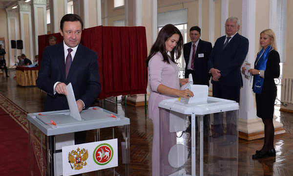 На избирательный участок №42, расположенный в здании Казанского национального исследовательского технического университета им.А.Н.Туполева, Председатель Правительства РТ прибыл вместе с супругой.